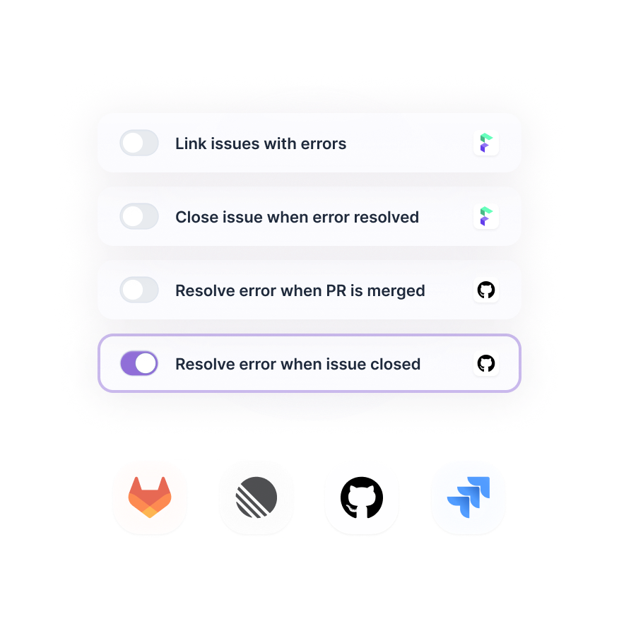 Flare easily connects with GitHub, GitLab, Jira, and Linear. Quickly create and close issues in sync with your favorite error tracker.